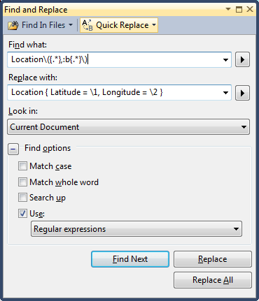 You can easily fix with a regex find/replace in VS:Find what – Location({.*},:b{.*})