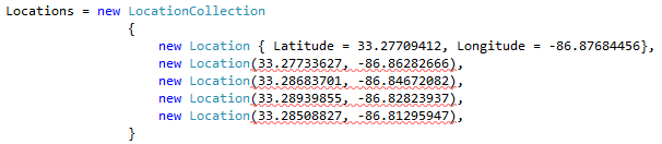 Replace with – Location { Latitude = 1, Longitude = 2 }