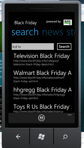 So here it is, just in time for the biggest shopping day of the year, the Black Friday Shopper app. This app provides all the discounts and shopping info for Black Friday shoppers on the go. I knew iPhone had similar apps so I decided WP7 should too. I worked some late nights on this to get it into the marketplace in time. I would have liked to get it out sooner but that’s life.